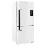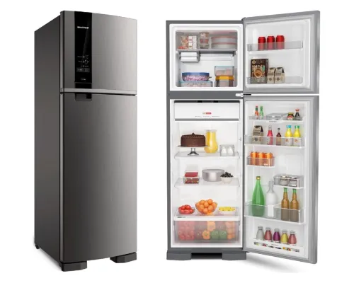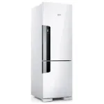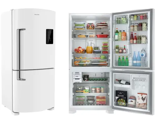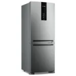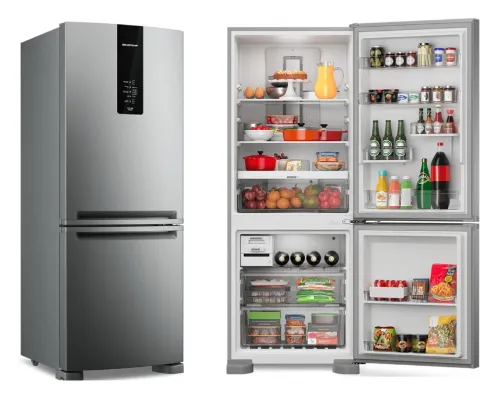 Já a melhor geladeira frost free top de linha é a Brastemp BRE57FK. Ela é indicada para quem busca um nível mais alto de acabamento, desempenho e organização. O conjunto entrega estabilidade térmica consistente, espaço interno muito bem aproveitado e uma construção que passa segurança em cada detalhe, das prateleiras robustas às gavetas bem desenhadas. O funcionamento silencioso e a iluminação eficiente reforçam a sensação de produto refinado, enquanto o sistema de produção de gelo integrado soma praticidade no uso mais exigente. É uma geladeira voltada para quem aceita investir mais para ter conforto, precisão e um padrão acima da média na cozinha.