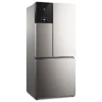 Esta geladeira side by side da Electrolux tem três portas, sendo que o freezer fica embaixo e o refrigerador na parte de cima. Um dos diferenciais é a porta do congelador reversível, que permite escolher o melhor lado para abertura dela de acordo com o espaço disponível. Essa praticidade é ideal para cozinhas e apartamentos pequenos, e é rara em modelos mais recentes de marcas grandes.