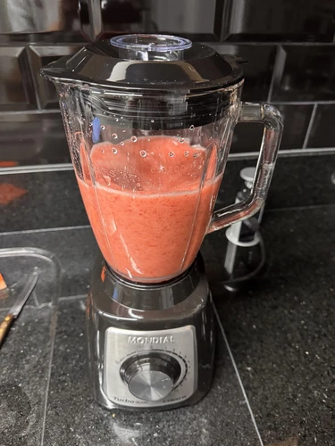 A jarra de vidro é pequena, mas muito bem construída. Aguenta bem variações de temperatura e permite bater preparos quentes sem receio, como sopas e caldos recém-saídos do fogo. Em sucos de limão com casca e água, a mistura ficou bem homogênea em pouco tempo, sem pedaços grandes sobrando. O vidro também ajuda bastante na higiene, não retém cheiro nem gosto de ingredientes mais fortes.