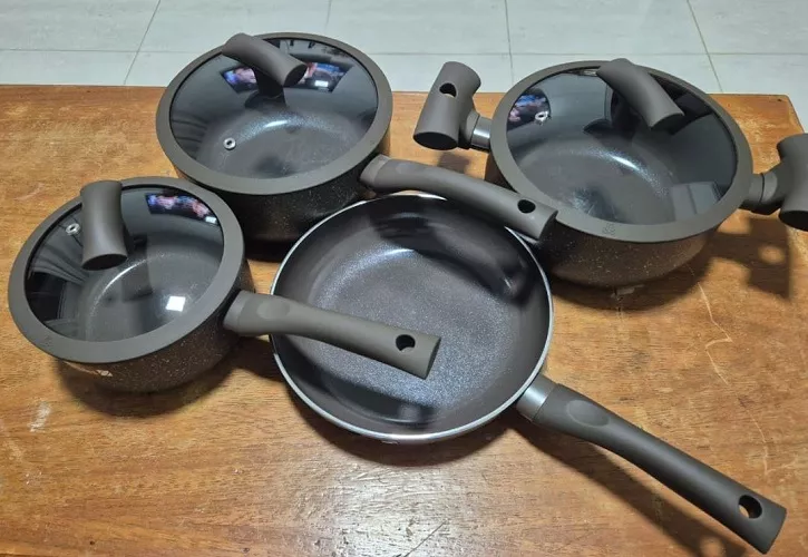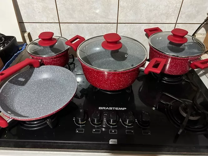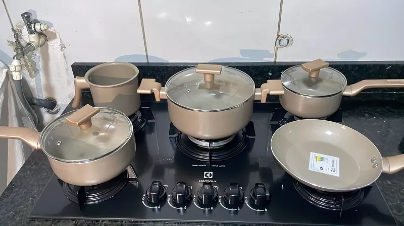 O conjunto é completo, com duas panelas, duas caçarolas, frigideira e leiteira. Para quem está começando ou quer renovar tudo de uma vez, resolve praticamente tudo na rotina. Preparei arroz diariamente em uma das médias e o resultado foi muito bom. A comida solta com facilidade quando usada corretamente, e a limpeza com o lado amarelo da esponja já dá conta sem esforço.